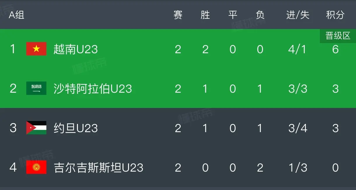 随着越南2:1绝杀吉尔吉斯斯坦,约旦3:2逆转东道主沙特,U23亚洲杯最残酷小组诞生,A组中两连胜的越南仍有被淘汰的可能性,东道主沙特末轮迎来生死战,不胜的话将大概率会出局。目前越南两战全胜排名第一,沙特和约旦各胜一场,约旦有胜负关系优势,吉尔吉斯斯坦虽然暂积0分,但是理论上仍有晋级可能。