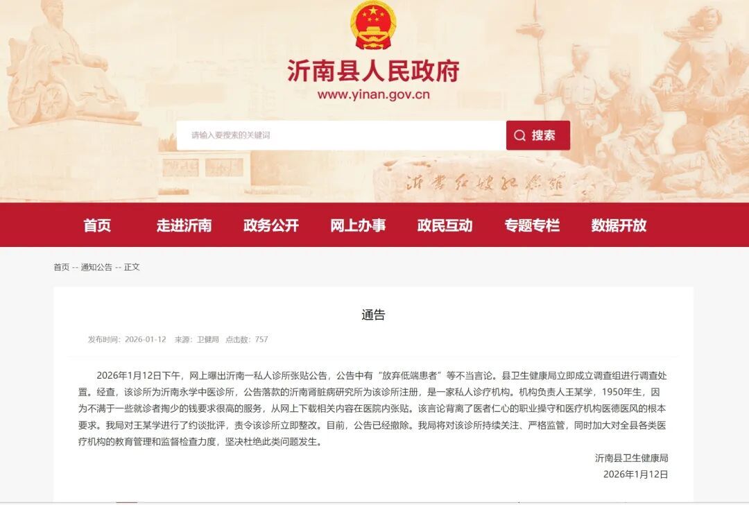 2026年1月12日下午,网上曝出沂南一私人诊所张贴公告,公告中有“放弃低端患者”等不当言论。县卫生健康局立即成立调查组进行调查处置。
