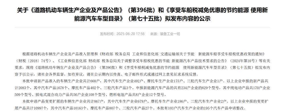 工信部发布第396批《道路机动车辆生产企业及产品公告》