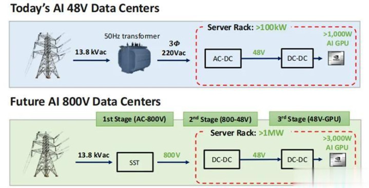 传统54V架构在超大功率场景下,电流强度、体积和损耗都难以满足需求,行业转向800V高压直流等新一代方案已是必然趋势。